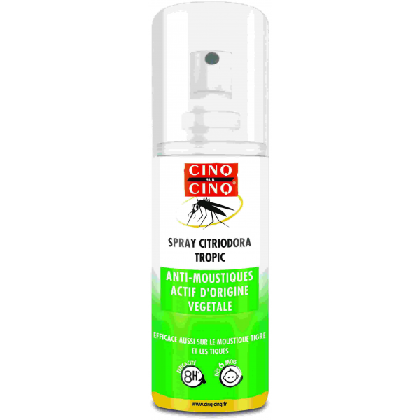Cinq sur Cinq Spray Anti-Moustiques est un répulsif anti-moustique qui offre une protection efficace à toute la famille, y compris les enfants, bébés à partir de 12 mois. Sa formule offre une efficacité totale durant 7 heures contre toutes les espèces de moustiques (dont le moustique tigre), les tiques, les aoûtats, les taons.