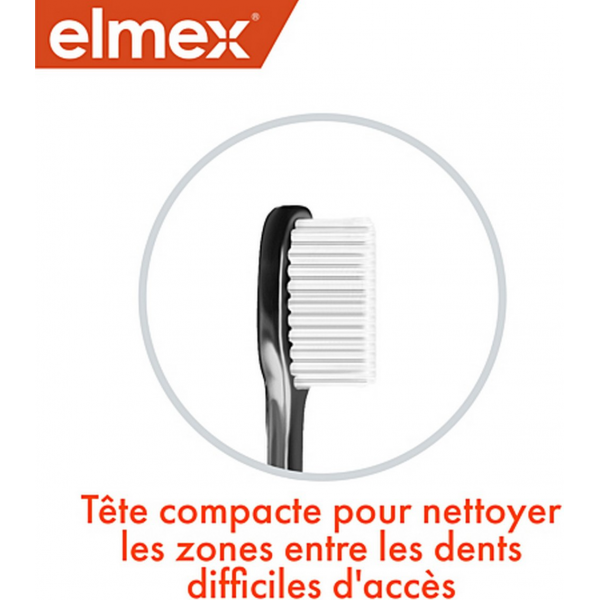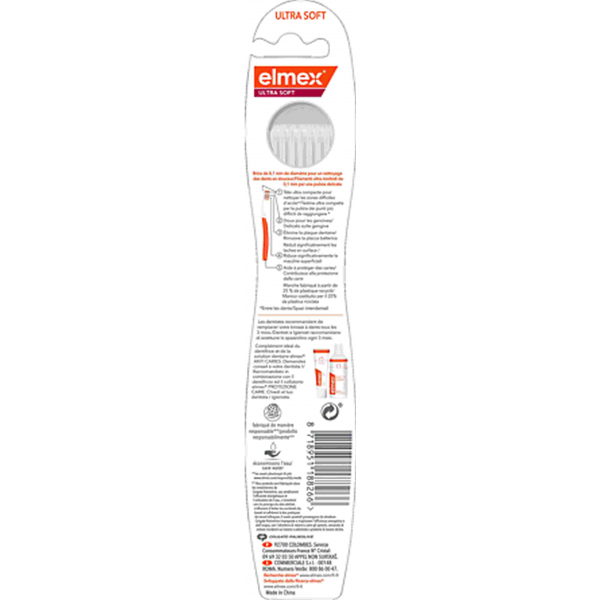Elmex Brosse à Dents Anti-caries Ultra Soft possède des brins coniques, plus fins mais plus denses environ 5600 soit 5 fois plus qu'une brosse à dents normale.