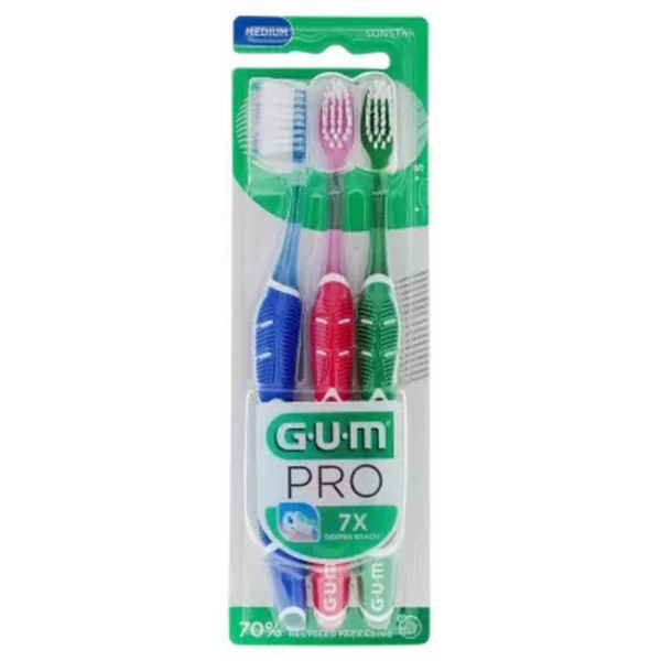 GUM PRO Brosse à Dents Medium Trio Pack - Couleur : Bleu - Rose - Vert