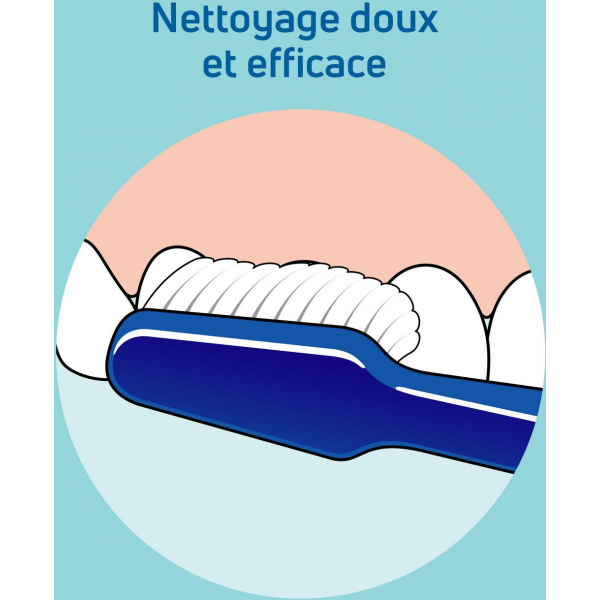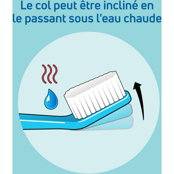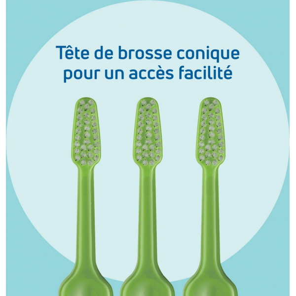 Cette brosse ergonomique contient une tête triangulaire dotée de brins très souples à bouts arrondis, pour un accès facile et un nettoyage optimal de toute la dentition.