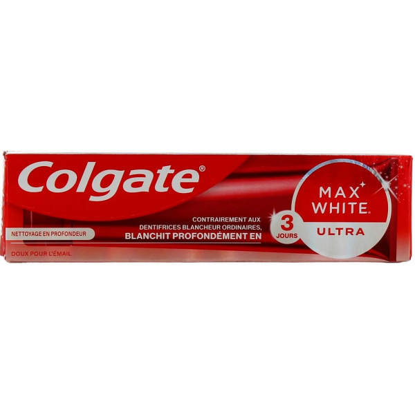 Le dentifrice Colgate Max White agit efficacement sur les taches superficielles causées par le café, le thé ou le tabac, qui ternissent l’éclat du sourire au fil du temps. Sa formule contient des azurants optiques qui se transforment en une mousse bleutée au contact du brossage, apportant un effet de blancheur immédiat. Utilisé régulièrement, il contribue à un blanchiment progressif et durable, tout en respectant la sensibilité des dents.