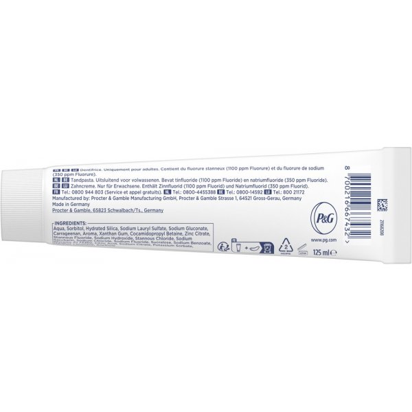 Aqua, Sorbitol, Hydrated Silica, Sodium Lauryl Sulfate, Sodium Gluconate, Carrageenan, Aroma, Xanthan Gum, Cocamidopropyl Betaine, Zinc Citrate, Stannous Fluoride, Sodium Hydroxide, Stannous Chloride, Sodium Saccharin, Sodium Chloride, Sodium Fluoride, Sucralose, Sodium Benzoate, Glycerin, CI 73360, Citric Acid, Sodium Citrate, Potassium Sorbate, Menthol, Limonene, Anethole.