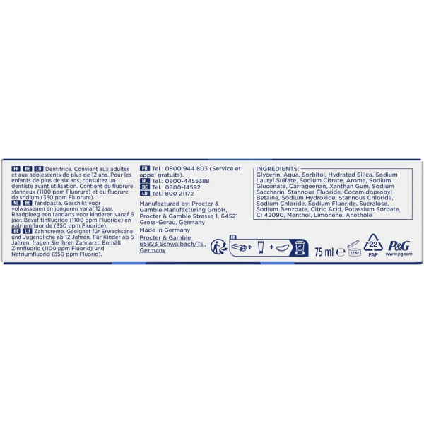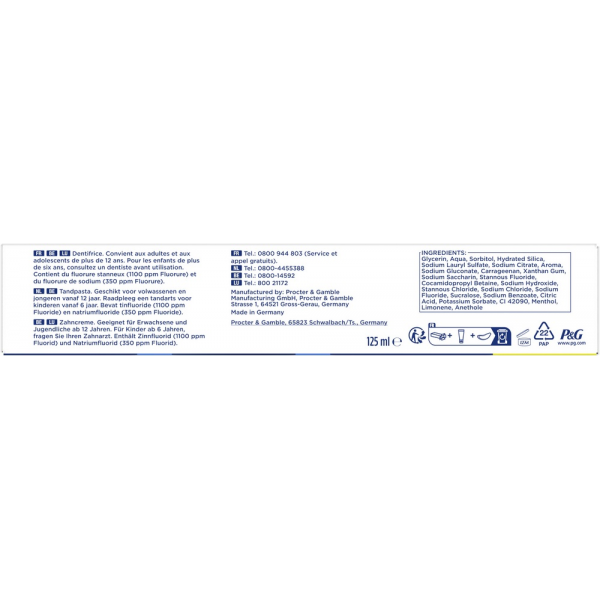 Formule INCI : Glycerin, Aqua, Sorbitol, Hydrated Silica, Sodium Lauryl Sulfate, Sodium Citrate, Aroma, Sodium Gluconate, Carrageenan, Xanthan Gum, Sodium Saccharin, Stannous Fluoride, Cocamidopropyl Betaine, Sodium Hydroxide, Stannous Chloride, Sodium Chloride, Sodium Fluoride, Sucralose, Sodium Benzoate, Citric Acid, Potassium Sorbate, CI 42090, Menthol, Limonene, Anethole