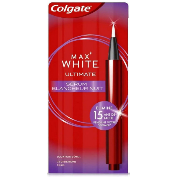 Grâce à sa technologie brevetée, ce soin blanchissant combine efficacité et confort. Il peut être utilisé chaque soir, même sur les dents sensibles, pour un résultat progressif et naturel. En seulement quelques applications, le sourire paraît plus lumineux et les dents visiblement plus blanches. Avec son format stylo de 2,5 ml, le sérum Colgate Max White offre environ 35 utilisations, parfait pour une routine de soin simple et efficace à intégrer avant le coucher.