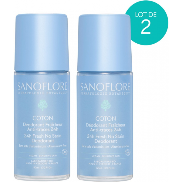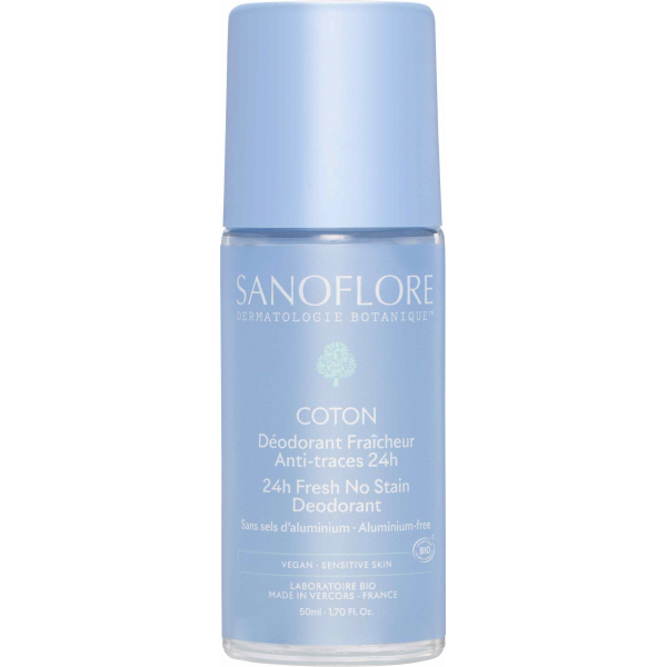 Sanoflore 24H Coton Déodorant Fraîcheur Anti-Traces Roll-On est un déodorant fraîcheur anti-traces qui convient aux peaux sensibles et réactives. 99% du total des ingrédients est d'origine naturelle et vegan : sans ingrédients d'origine animale ou dérivés. Fabriqué en France.
