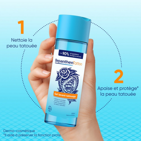 Le Gel Lavant BepanthenDermo Tattoo Gel Lavant est spécifiquement formulé pour les peaux tatouées.