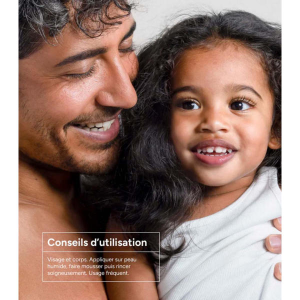 Appliquer sur peau humide, faire mousser puis rincer soigneusement