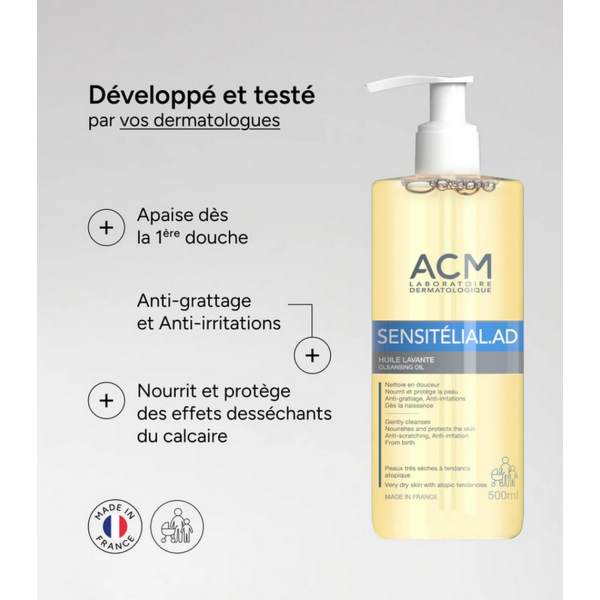L’huile lavante Sensitélial AD du Laboratoire ACM, en format 200 ml, a été spécialement formulée pour nettoyer en douceur les peaux sensibles dès la naissance tout en préservant l’équilibre du microbiote cutané. Grâce à sa texture enveloppante et à sa composition nourrissante, elle protège efficacement la peau du dessèchement, notamment des effets irritants du calcaire présent dans l’eau.