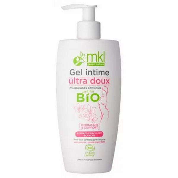 Le Gel d'Hygiène Intime BIO** 200ml Ultra Doux de MKL Green Nature est spécialement conçu pour apporter confort et hydratation au quotidien. Adapté aux muqueuses sensibles, ce gel haute tolérance associe un prébiotique naturel et un extrait d'orchidée blanche pour maintenir l'équilibre de la flore intime. Grâce à ses propriétés apaisantes, protectrices et rafraîchissantes, il respecte la sensibilité des muqueuses tout en les hydratant. Ce produit est idéal pour les femmes enceintes et allaitantes, et est testé sous contrôle gynécologique. De plus, sa formule sans savon et sans parfum est composée à 98% d'ingrédients naturels, dont 10% sont issus de l'Agriculture Biologique. Certifié Cosmos Organic par Ecocert Greenlife selon le référentiel Cosmos, ce gel est fabriqué en France.