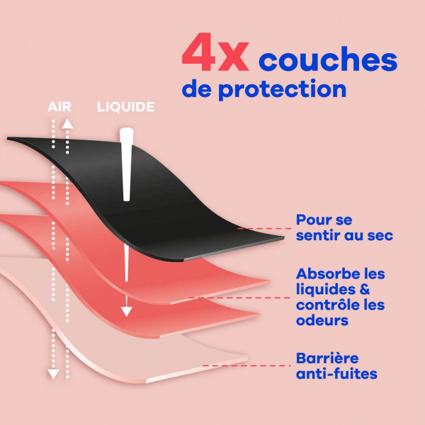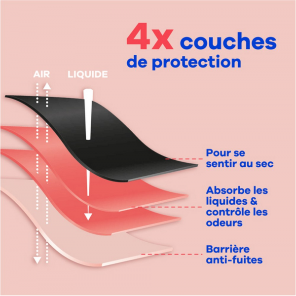 Grâce à ses 4 couches de protection, cette culotte offre une tranquillité d'esprit pouvant aller jusqu'à 12 heures de protection contre les fuites, même pendant les jours de flux moyen à abondant.