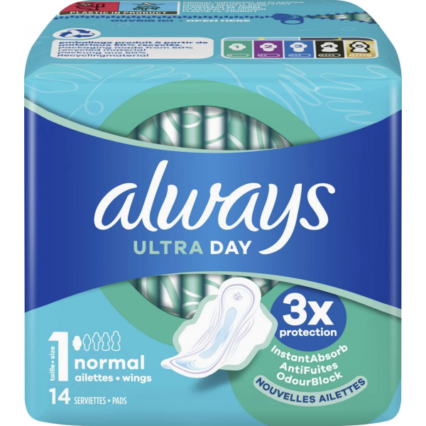 Always Ultra Day 14 Serviettes Hygiéniques Taille 1 sont des serviettes hygiéniques parfumées offrant une triple protection pendant la journée (taille 1, normal). Elles permettent :