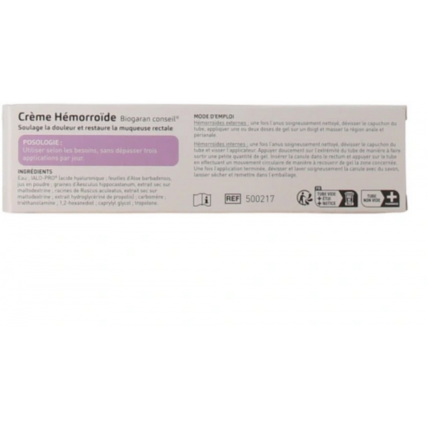 - Hémorroïdes internes : Procéder à un nettoyage soigneux de l’anus, puis visser l’applicateur sur le tube. Presser légèrement afin de faire sortir une petite quantité de gel, insérer la canule dans le rectum et appliquer le produit par un mouvement circulaire pour recouvrir la zone concernée. Après utilisation, dévisser l’applicateur, le laver soigneusement à l’eau et au savon, le laisser sécher, puis le remettre dans son emballage.