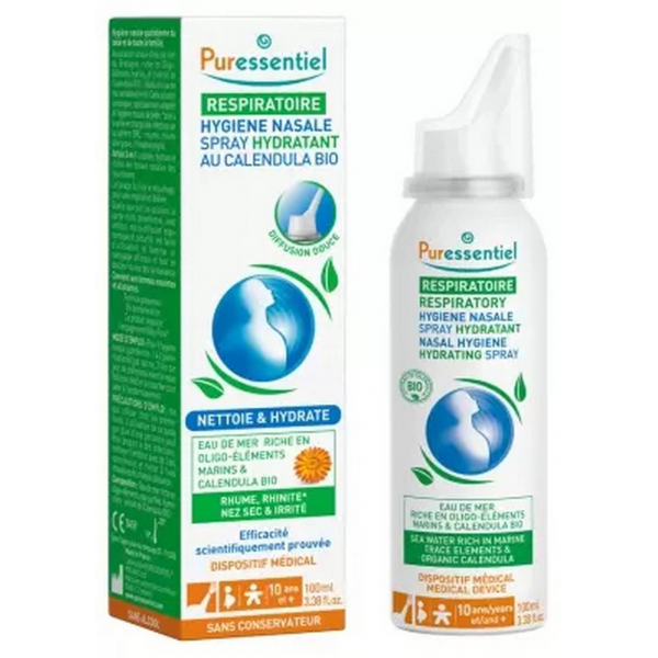 Spécialement formulé pour l’hygiène du nez en cas de rhume, rhinite, de nez sec ou irrité, le spray Puressentiel Respiratoire associe de l’eau de mer et de l’extrait de calendula bio.