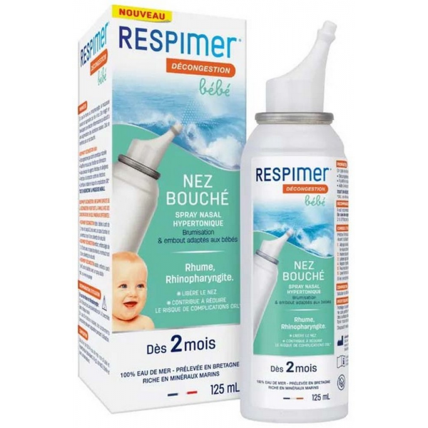 Spray nasal Respimer Décongestion Bébé 100 ml, à base d’eau de mer hypertonique naturelle, conçu pour soulager le nez bouché des bébés dès 2 mois. En savoir +