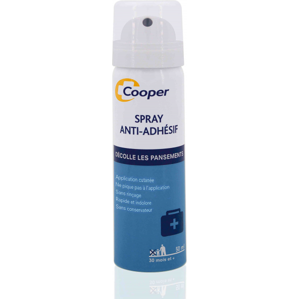 Le Spray Anti-Adhésif Stérile du laboratoire Cooper vous aide à éliminer les résidus de colle afin d'enlever délicatement vos pansements, bandes adhésives sparadraps ou strappings.