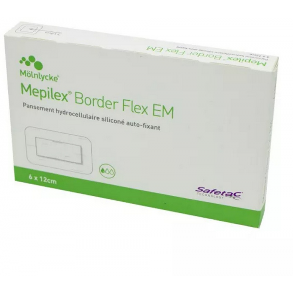 Le pansement hydrocellulaire Mepilex Border Flex EM possède une enduction de silicone provenant de l'interface Safetac. Cela permet un retrait atraumatique, sans douleur et qui prévient la macération. Il génère un milieu humide qui favorise le processus de cicatrisation. Enfin, la technologie Flex permet une conformité optimale. Elle apporte une flexibilité à 360° et garantit un maintien optimal tout en minimisant le risque de décollement du pansement et le stress de la peau.