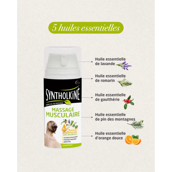 HE de pin, HE d'orange douce, HE de gaulthérie, HE de romarin, HE de lavande, excipients qsp 100 %.formule INCI : Aqua, caprylic-capric triglyceride, isopropyl alcohol, menthol, Pinus mugo leaf oil, acrylates-C10-30 alkyl acrylate crosspolymer, benzyl benzoate, phenoxyethanol, ethyl acetate, ammonium hydroxide, fragance, Rosmarinus officinalis leaf oil, Citrus aurantium dulcis oil, Lavandula angustifolia oil, Gaultheria procumbens leaf oil, limonene, citral, linalool.