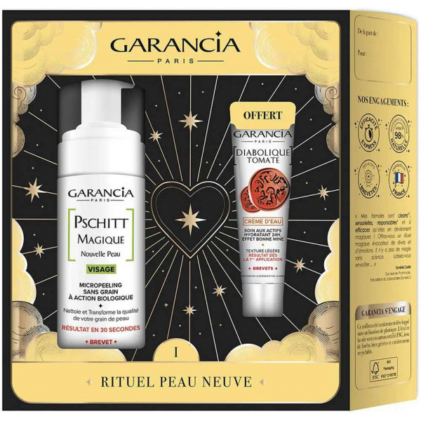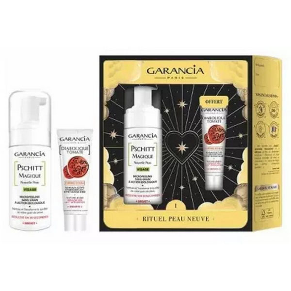 Le Coffret Rituel Peau Neuve Garancia, une routine inspirée des rituels de beauté japonais pour purifier, régénérer et illuminer le visage. Ce coffret associe le célèbre Pschitt Magique Nouvelle Peau et la Crème d’Eau Diabolique Tomate, deux soins complémentaires pour transformer la texture et l’éclat de la peau en douceur.