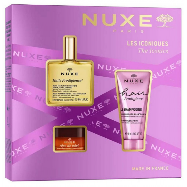 Au cœur de ce coffret, l’Huile Prodigieuse Nuxe, véritable soin multi-usages, nourrit, adoucit et sublime la peau comme les cheveux. Sa texture sèche et son parfum envoûtant en font un geste beauté emblématique et sensoriel. Le Baume Lèvres Rêve de Miel, formulé à base de miel et d’huiles végétales précieuses, hydrate intensément et répare les lèvres sèches ou abîmées, leur redonnant douceur et confort durable. Enfin, le Shampooing Hair Prodigieux, adapté à tous les types de cheveux, nettoie délicatement la chevelure, la laissant souple, brillante et délicatement parfumée. Fabriqués en France, ces trois soins emblématiques allient naturel, efficacité et plaisir d’utilisation.