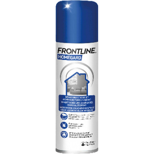 Ce spray ménager Frontline Homegard aide à éliminer les puces, les larves et les tiques présentes dans la maison et l'environnement (voiture, niche...).