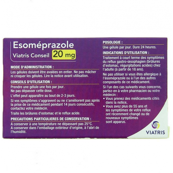 Esompérazole 20 mg Viatris Conseil est un médicament indiqué dans le traitement à court terme des symptômes du reflux gastro-œsophagien tels que les brûlures d’estomac et les remontées acides. Ce médicament se présente sous la forme de gélules gastro-résistantes à prendre par voie orale. Il agit en réduisant la production d’acide par l’estomac, permettant ainsi de soulager les symptômes liés à l’excès d’acidité.