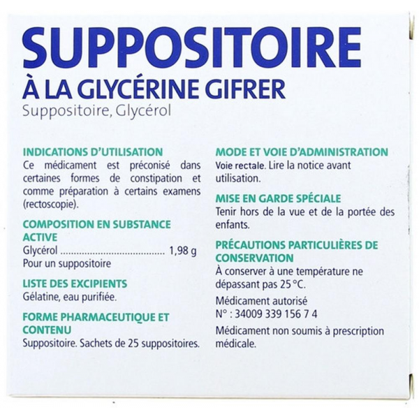 Le suppositoire à la glycérine Gifrer est un médicament préconisé dans certaines formes de constipation et comme préparation à certains examens.