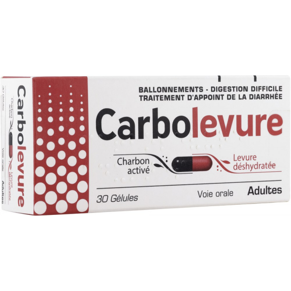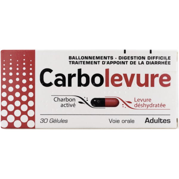 Le médicament Carbolevure Adultes est un médicament du laboratoire Pierre Fabre. Carbolevure Adultes contient du charbon activé et une levure. Le charbon a pour effet d'absorber les gaz retrouvés dans le tractus intestinal, et les substances que sont les levures contribuent à l'équilibre de la flore afin d'assurer une digestion normale. Le traitement Carbolevure Adultes trouve donc ses indications dans les troubles symptomatiques lors de la digestion, notamment avec ballonnements, et le traitement symptomatique de la diarrhée, en association de la réhydratation et des mesures diététiques. Le Carbolevure Adultes est un médicament réservé aux adultes, et présenté sous la forme d'une gélule noire et rouge, conditionné en boite de 30 gélules.