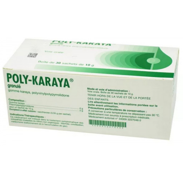 Vous retrouverez le produit Poly-karaya en pharmacie, en boite de 30 sachets de granulés. Ce médicament n’est pas remboursé. Chaque sachet de granulés Poly-Karaya contient 4 grammes de gomme Karaya, 2 grammes de crospovidone, et 3.55 grammes de saccharose.