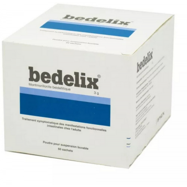 Le Bedelix agit en protégeant les muqueuses de votre estomac et de votre intestin. Il se présente sous la forme de sachet de poudre pour reconstituer une suspension buvable. Bedelix contient du Montmorillonite beidellitique, une argile naturelle qui tapisse la muqueuse digestive. La poudre est très fine et devient visqueuse au contact de l'eau, ce qui lui permet d'absorber les toxines bactériennes au niveau intestinal. Bedelix est un pansement intestinal qui ne gonfle pas et ne provoque pas de ballonnements. Il n'a aucun effet sur le transit intestinal, il ne provoque ni diarrhées, ni constipation. La posologie du Bedelix est de 3 sachets à prendre par jour, à distance des repas. Bedelix a un goût de réglisse et de vanille. Il contient du glucose, une précaution est nécessaire pour les personnes souffant de malabsorption du glucose. De même Bedelix contient de l'hydroxyde d'aluminium dont il faut tenir compte chez les patients dialysés. Par ses propriétés de pansement du tube digestif, Bedelix peut modifier l'action d'autres médicaments. Si vous prenez d'autres traitements, prenez les à distance du Bedelix.Questions fréquemments posées sur Bedelix Sachets