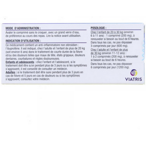 Chez l'adulte et l'enfant de plus de 30 kg (environ 11-12 ans): 1 à 2 comprimés (200 mg à 400 mg), à renouveler si besoin au bout de 6 heures. Dans tous les cas, ne pas dépasser 6 comprimés par jour (1200 mg).