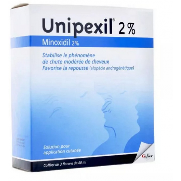 Unipexil Minoxidil est un médicament indiqué dans la chute de cheveux, dans les situations d'alopécies androgénétiques chez l'adulte. Le dosage de 5 % est réservé à l'homme, et le 2 % à la femme. Cette solution est retrouvée en format solution pour un soin cutané local. Les flacons pompe sont surmontés d'un système de pulvérisateur pour une application précise. Votre pharmacien pourra, après conseil, vous délivrer des boites de un ou de trois flacons du médicament Unipexil Minoxidil. La solution Unipexil Minoxidil 2% se compose de 2 grammes de Minoxidil pour 100 ml de solution. Le produit Unipexil Minoxidil contient aussi des agents non actifs appelés excipients et à prendre en compte. Vous retrouverez la liste de ces ingrédients sur la notice de ces médicaments. On retrouve par exemple du propyleneglycol et de l'éthanol.