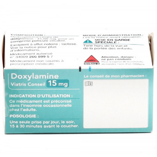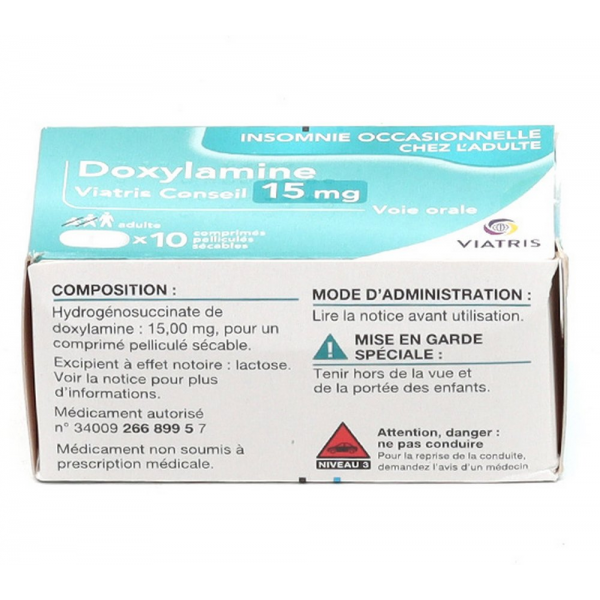 Doxylamine Mylan Viatris est indiqué dans les cas d'insomnies occasionnelles. Il est important d'insister sur l'aspect occasionnel de la prise de ce médicament qui ne doit pas être utilisé sur de longs termes. On considère qu'il ne faut pas dépasser 5 jours de traitement. Pour améliorer l'endormissement et comme solution qui peut être utilisée sur un délai pus long, de la mélatonine peut être proposée. Elle permet d'induire l'endormissement et ne possède pas d'effets indésirables. Doxylamine Mylan Viatris induit en effet des somnolences et des effets à long terme. N'oublions pas non plus que ce médicament n'agit que sur la période d'endormissement. Il ne sera donc pas conseillé pour la prise en charge de réveils précoces ou au cours de la nuit. Avant la prise d'un médicament pour favoriser le sommeil, veillez à bien adopter les mesures pour vous aider à mieux dormir. Pour cela, rendez votre chambre accueillante pour préparer le sommeil. Il est toujours préférable d'aller se coucher dans une chambre bien rangée, dans l'obscurité et le calme. Il est déconseillé de regarder la télé dans son lit ou d'y travailler. Un bon livre peut aussi aider à trouver le sommeil.