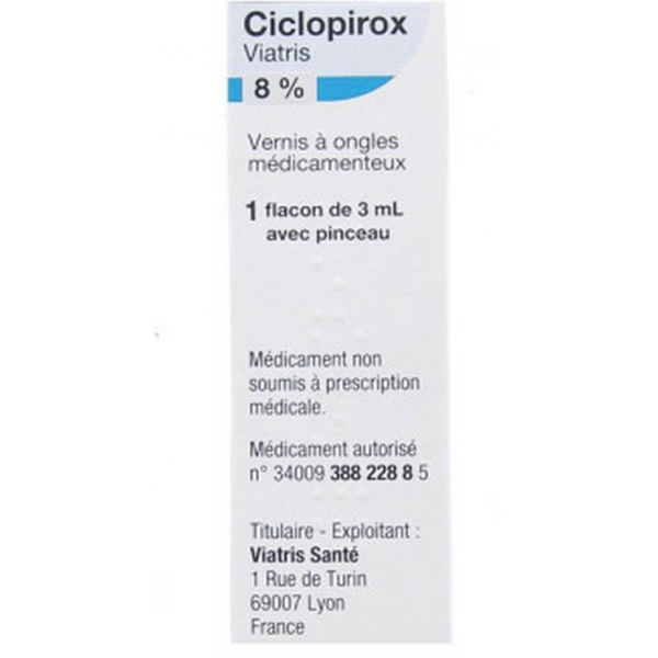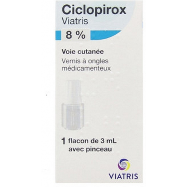 Ciclopirox Viatris vernis est un vernis à ongles médicamenteux utilisé comme traitement de première intention des mycoses des ongles de pieds et des mains, également appelées onychomycoses. Tel un vernis traditionnel, il se présente sous la forme d’un flacon en verre blanc transparent avec un bouchon à vis muni d’un pinceau applicateur.