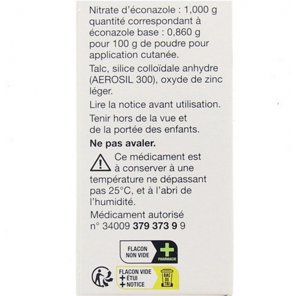 L'Econazole Poudre Mylan Viatris est un médicament antifongique utilisé pour le traitement des infections cutanées causées par des champignons. Le nitrate d'éconazole est un dérivé imidazolé doué d'une activité antifongique et antibactérienne. La forme poudre du médicament Econazole permet une application simple, facile et uniforme sur la zone infectée. Le nitrate d’éconazole est indiqué dans le traitement des candidoses cutanées. Cette poudre d’éconazole est utilisée pour traiter les mycoses des plis macérés comme intertrigo génital, sous-mammaire et interdigital. La poudre d’éconazole est un médicament utilisé pour traiter les dermatophyties notamment dans le traitement intertrigo macéré génital et crural et l’intertrigo des orteils. Le médicament Econazole poudre Mylan Viatri pour application cutanée en flacon est disponible dans votre pharmacie sans ordonnance.