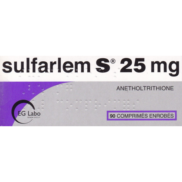 Sulfarlem comprimés est un médicament à base d’Anétholtrithione utilisé dans le traitement d'appoint des hyposialies. Sulfarlem a également des indications dans le traitement d'appoint des insuffisances de sécrétion lacrymale. Sulfarlem est un médicament qui se présente sous la forme d’un comprimé enrobé. Une boîte de Sulfarlem contient 60 comprimés. Ce médicament est disponible à l’achat sans ordonnance du médecin sur notre site et directement en pharmacie.