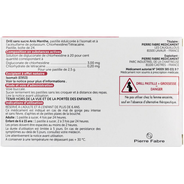 Ne prenez jamais DRILL SANS SUCRE ANIS MENTHE, pastille édulcorée à l'isomalt et à l'acésulfame de potassium: