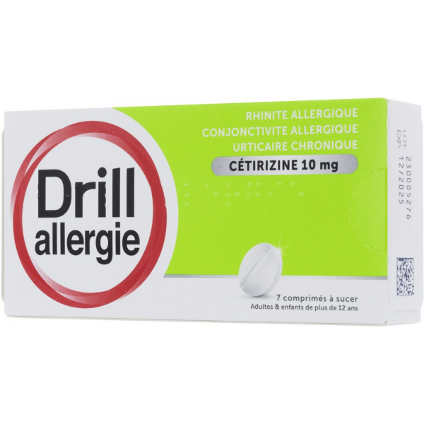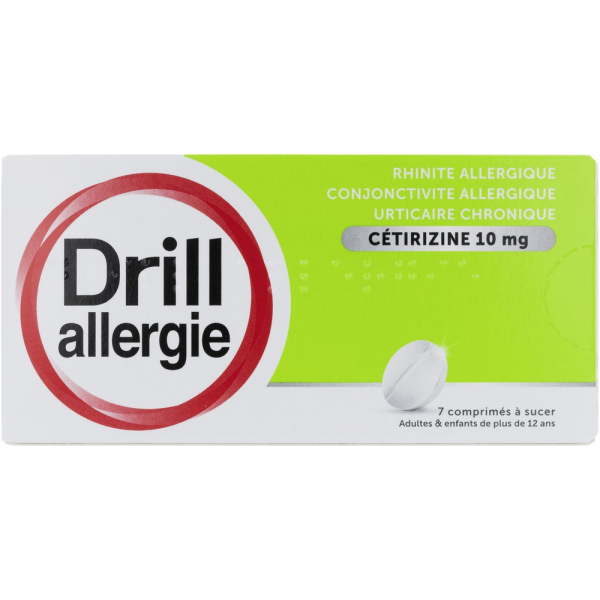 Drill allergie est un médicament à base de dichlorhydrate de cétirizine. Drill allergie cétirizine est un médicament antiallergique. Drill allergie cétirizine est un médicament réservé à l'adulte et l'adolescent de plus de 12 ans. Ce médicament a plusieurs indications. Il a des indications pour le traitement des symptômes nasaux et oculaires de la rhinite allergique saisonnière, ainsi que pour le traitement des symptômes de l'urticaire chronique (urticaire chronique idiopathique). Drill allergie se présente sous la forme de comprimés à sucer. Une boîte de Drill allergie contient 7 comprimés.